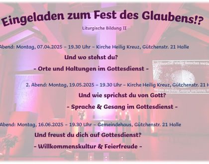 Hier finden Sie alle Gottesdienste rund um die Feiertag in der Stadt Halle (Saale). Achten Sie dennoch auf die Vermeldungen. Denn alle Angaben sind ohne Gewähr. >>> 2025_Gottesdienste_Weihnachten